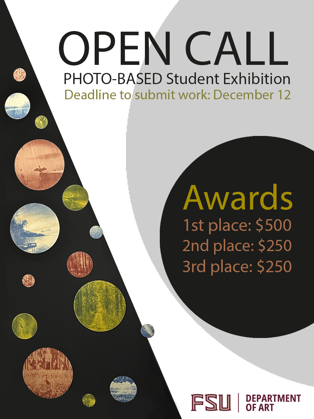 The Photography and Moving Image area in the Department of Art at Florida State University invites graduate and undergraduate students to submit work for a juried photo-based exhibition that will be held at the Fine Arts Building (FAB) Gallery in early spring 2026. The exhibition will open on January 15, 2026, with an awards ceremony during the reception, where selected artists will receive cash prizes. This call is open to all themes and processes. We welcome a wide range of approaches and techniques in image-making, including film photography, digital work, experimental projects, photo-objects, and photo installations.