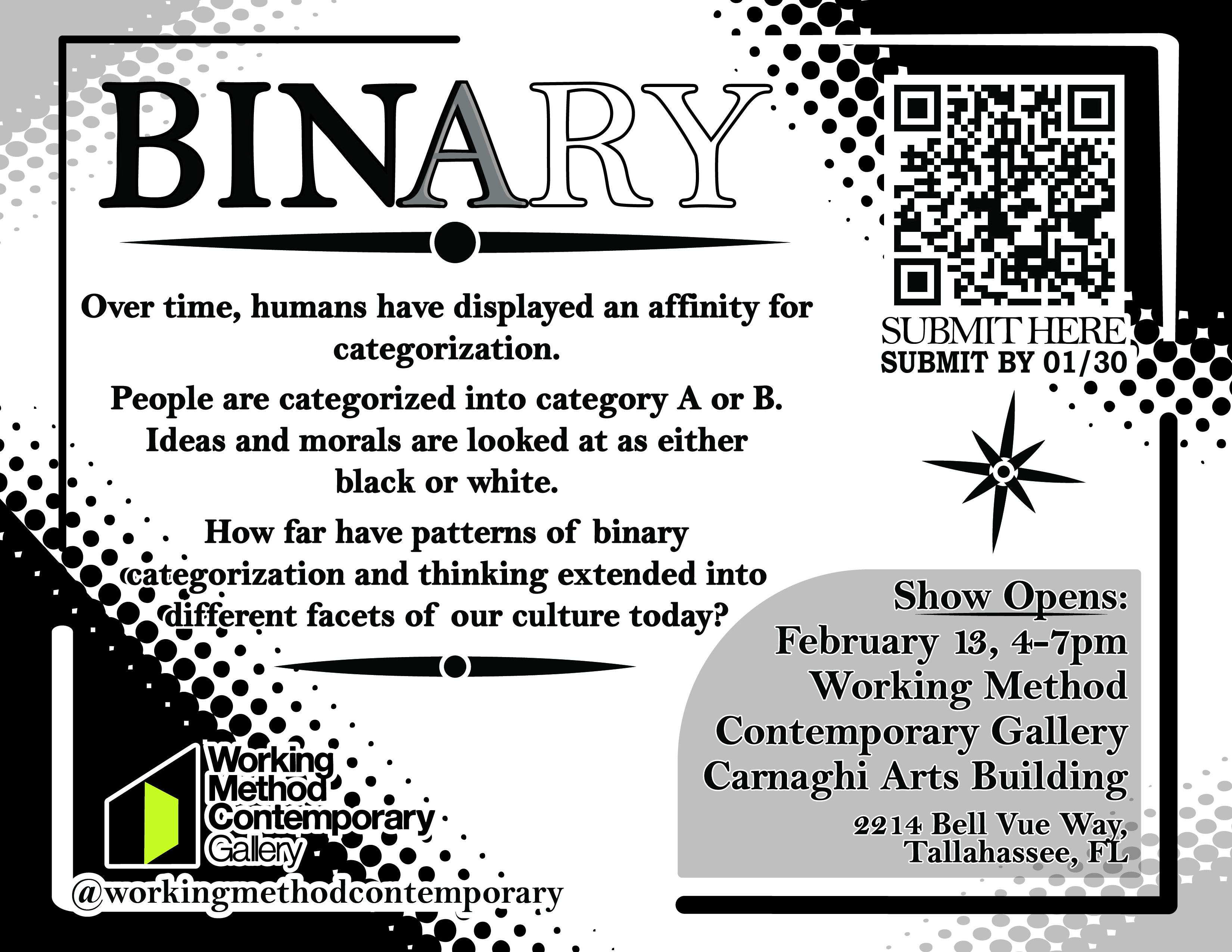 How far have patterns of binary categorization and thinking extended into different facets of our culture today? Is this for better, for worse, or both? This open call is for artwork that explores and responds to binary forms of thinking and categorization present within our current society. Binary can be explored through expressions of what our current society deems as “black” or “white,” or even the “gray” spaces in-between that exist outside of categorization. This can be explored in specific or broader contexts.