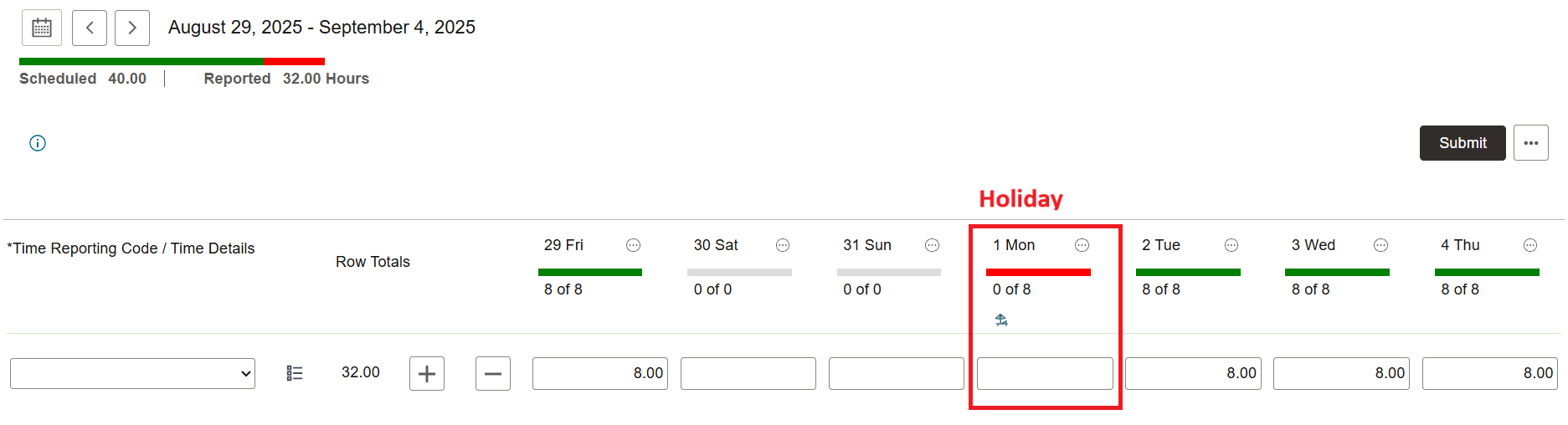 2. The OMNI HR elapsed timesheet will show no hours (blank) for September 1. The holiday hours will be added automatically by the system. See the example below: