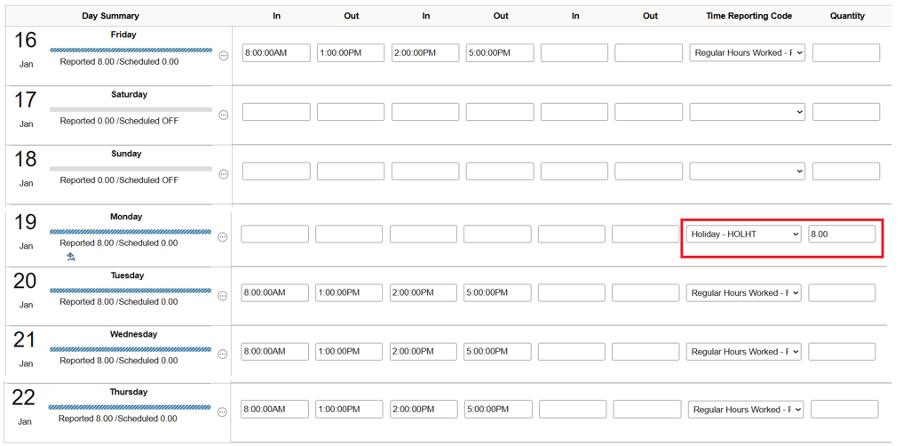 * Nonexempt USPS employees using the USPS punch timesheet must enter their holiday hours for January 19. See the example below: