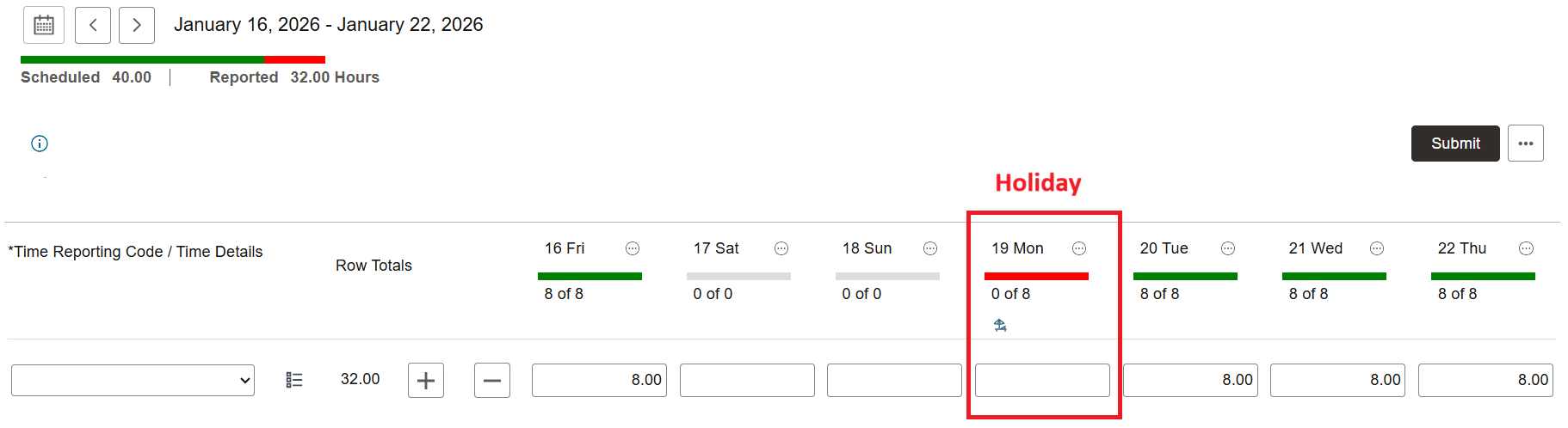 Reporting MLK Day Holiday for the workweek of January 16 - January 22: