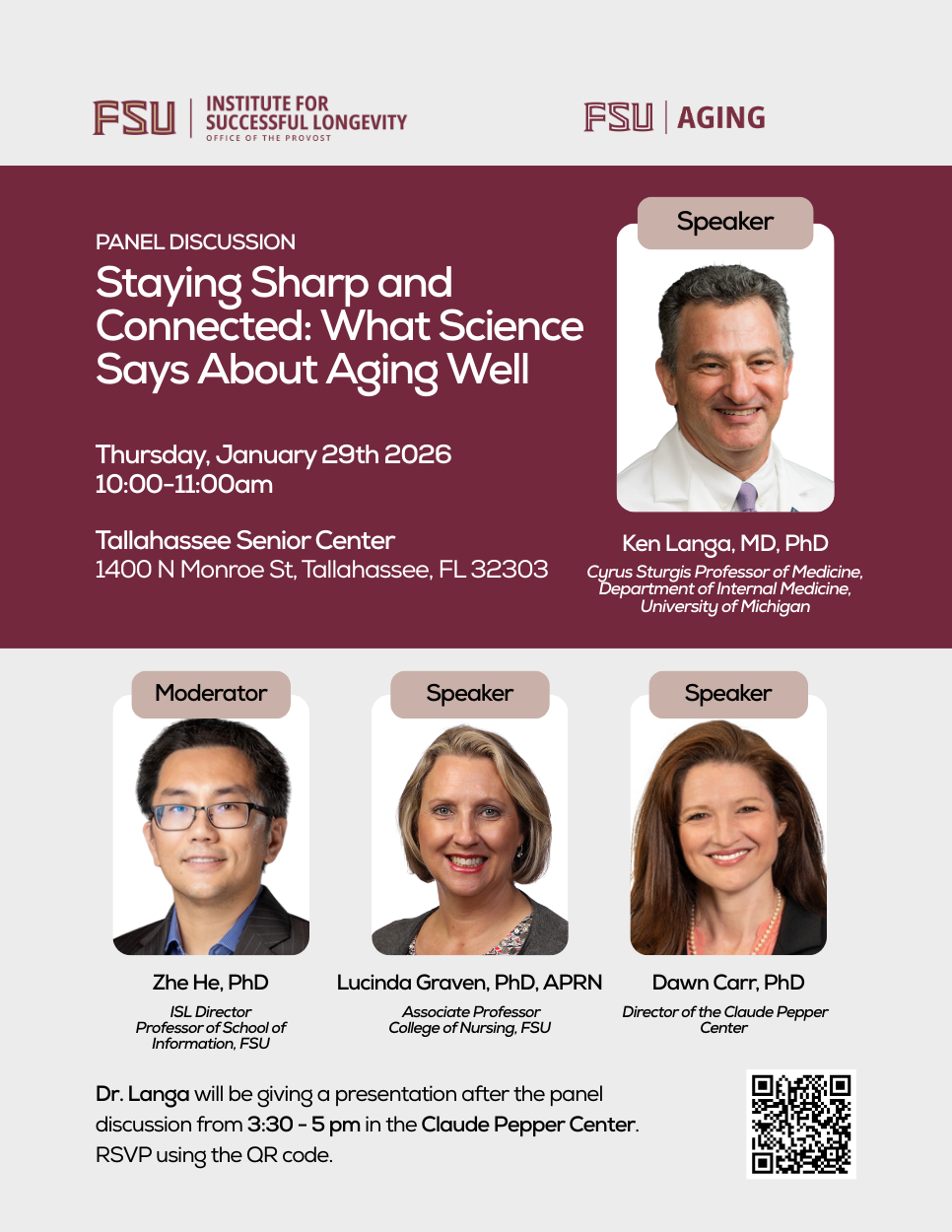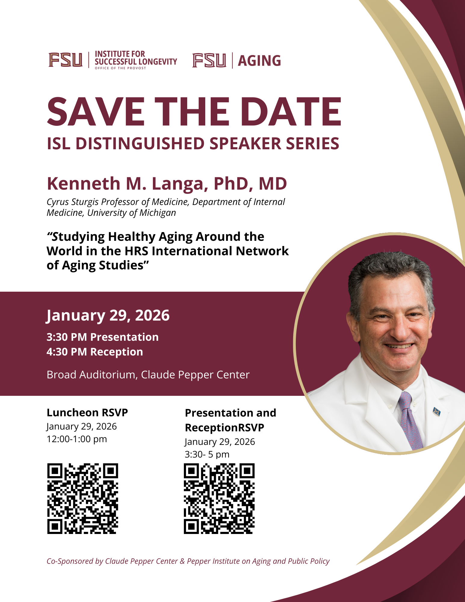 Distinguished Lecture titled “Study Healthy Aging Around the World in the HRS International Network of Aging Studies” at the Broad Auditorium of the Claude Pepper Center (Lecture 3:30 PM - 4:30 PM, Reception 4:30 PM - 5 PM) (RSVP link: https://fsu.qualtrics.com/jfe/form/SV_1A3wYTfdykIzUTY<https://nam04.safelinks.protection.outlook.com/?url=https%3A%2F%2Ffsu.qualtrics.com%2Fjfe%2Fform%2FSV_1A3wYTfdykIzUTY&data=05%7C02%7Cisl%40lists.fsu.edu%7C5fb3539e7b794a68e9d608de3809164b%7Ca36450ebdb0642a78d1b026719f701e3%7C0%7C0%7C639009808842395520%7CUnknown%7CTWFpbGZsb3d8eyJFbXB0eU1hcGkiOnRydWUsIlYiOiIwLjAuMDAwMCIsIlAiOiJXaW4zMiIsIkFOIjoiTWFpbCIsIldUIjoyfQ%3D%3D%7C0%7C%7C%7C&sdata=WghS%2BgYIDfktFrqoUsegbPwjsuoDMgORr6j4fN%2FH82A%3D&reserved=0>)