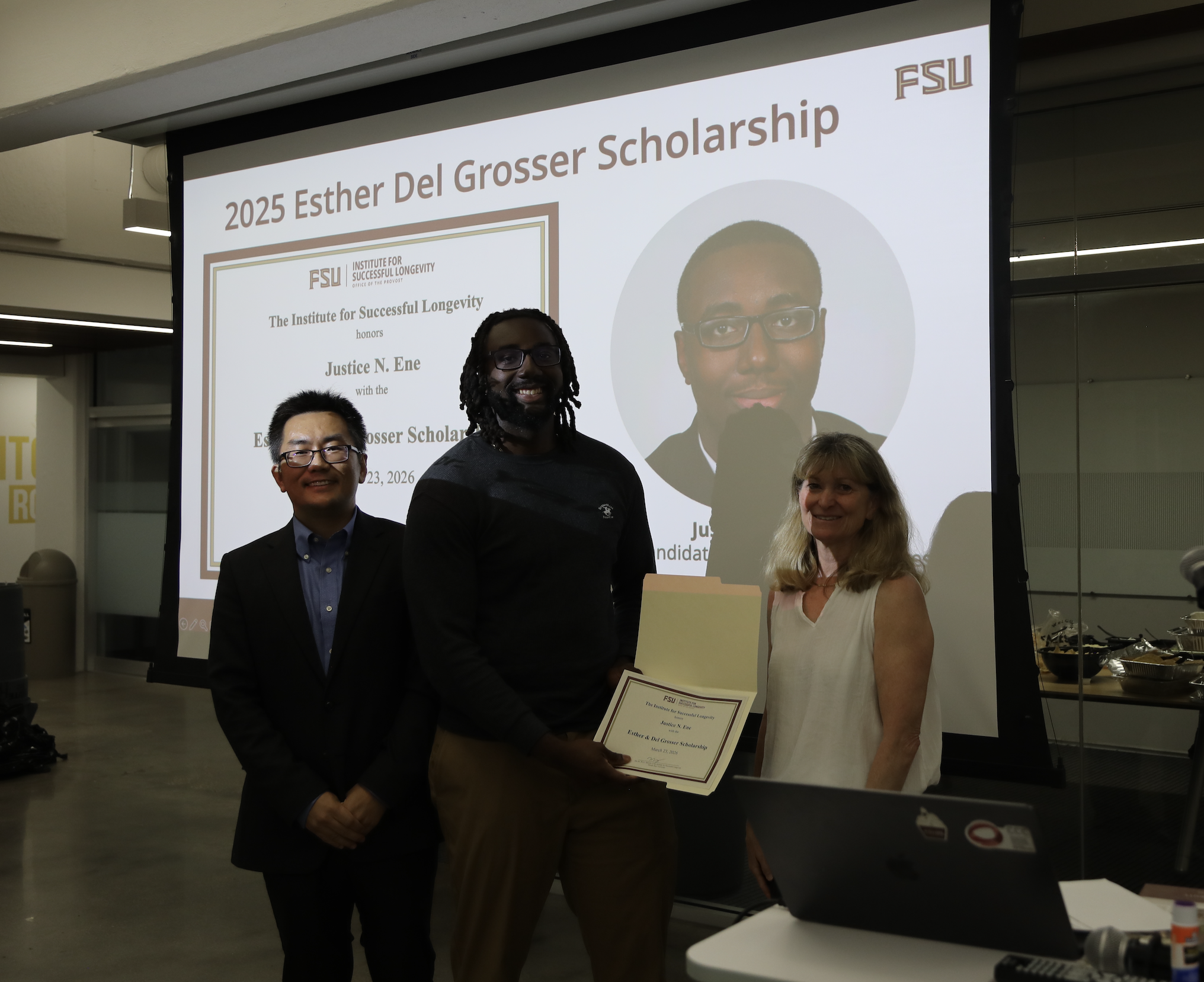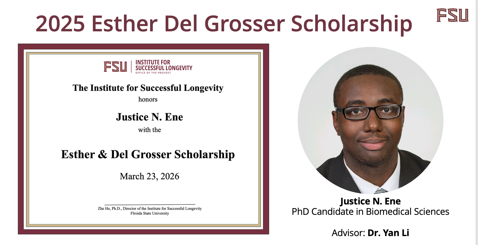 We are pleased to announce that Justice Ene, a Ph.D. candidate in Biomedical Engineering at the FAMU–FSU College of Engineering, has been selected as the recipient of the 2026 Esther & Del Grosser Scholarship from the Institute for Successful Longevity (ISL).