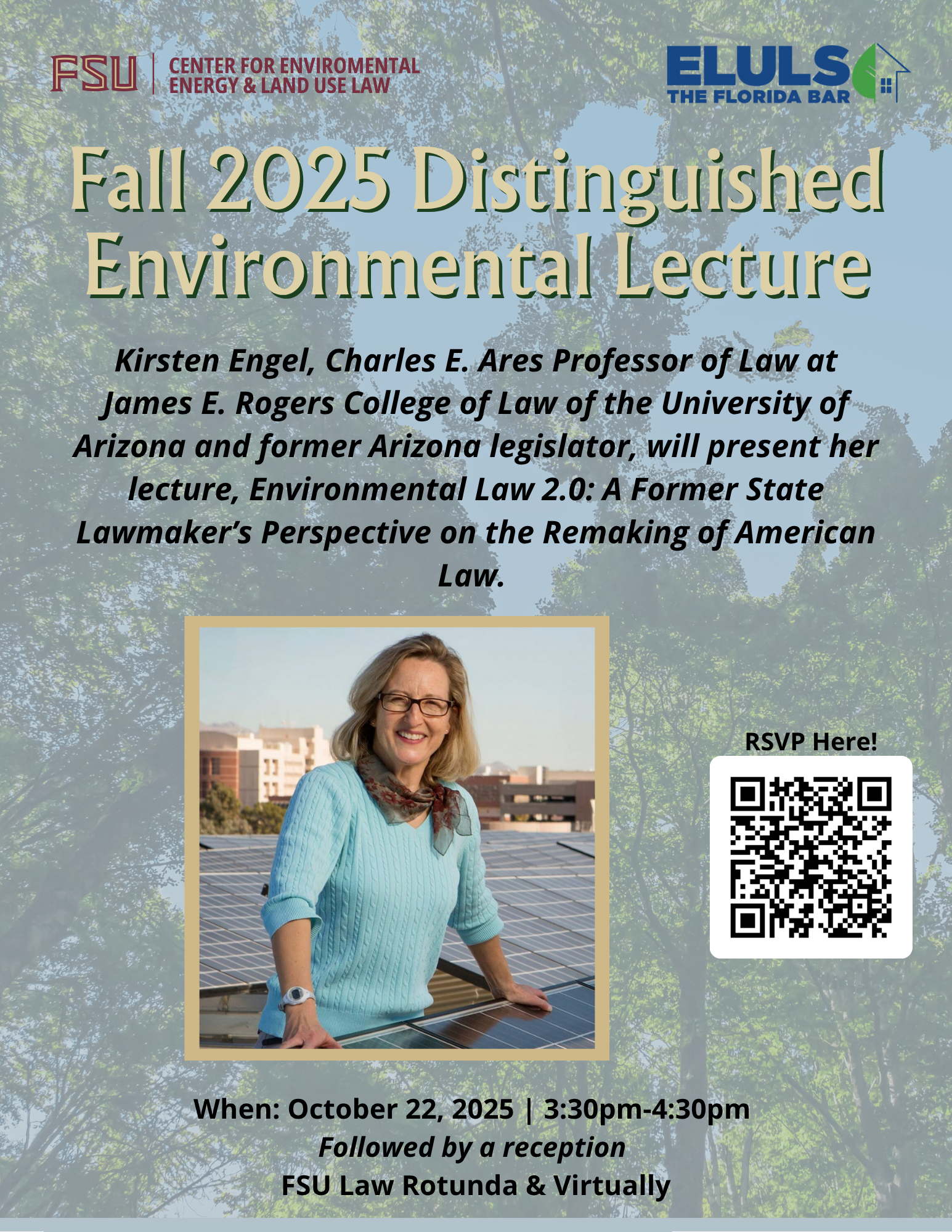 The FSU Center for Environmental, Energy, and Land Use Law is proud to welcome Kirsten Engel - former Arizona state legislator, Interim Chief of the Environmental Protection Unit in the Arizona Office of Attorney General, and Charles E. Ares Professor of Law at the James E. Rogers College of Law - to deliver our Fall 2025 Distinguished Lecture, Environmental law 2.0: A Former State Lawmaker's Perspective, next Wednesday, October 22nd, at 3:30pm in the Law School Rotunda and online.