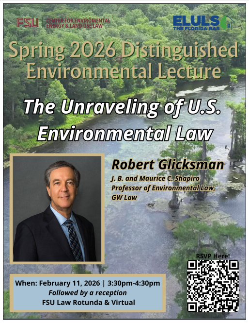 Please join us on Wednesday for the Spring Distinguished Environmental Lecture at FSU Law with Professor Robert Glicksman of George Washington University, who will speak on "The Unraveling of U.S. Environmental Law." We welcome you either in person or remotely through our livestream-more details and registration information below and at our Events<https://nam04.safelinks.protection.outlook.com/?url=https%3A%2F%2Flaw.fsu.edu%2Facademics%2Facademic-programs%2Fjuris-doctor-program%2Fenvironmental-energy-land-use-law%2Fenvironmental-program-events&data=05%7C02%7Claw-envtlfsufaculty%40lists.fsu.edu%7Cf93803b9c118436f072908de67f555c6%7Ca36450ebdb0642a78d1b026719f701e3%7C0%7C0%7C639062500573695650%7CUnknown%7CTWFpbGZsb3d8eyJFbXB0eU1hcGkiOnRydWUsIlYiOiIwLjAuMDAwMCIsIlAiOiJXaW4zMiIsIkFOIjoiTWFpbCIsIldUIjoyfQ%3D%3D%7C0%7C%7C%7C&sdata=7B1e0rlifup6W3v7yQ%2FozuT4dK%2B042i5vUOIOfiWsao%3D&reserved=0> page: